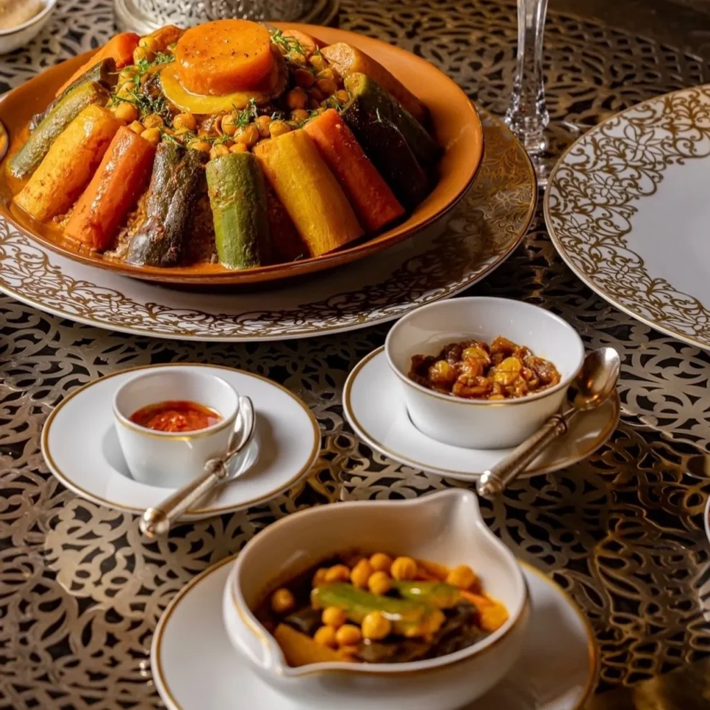 Dans les quartiers modernes de Gueliz, le couscous aux sept légumes est le plat de prédilection des grandes tablées familiales du vendredi. Cette recette symbolique associe traditionnellement carottes, courgettes, navets, potiron, chou, pois chiches et tomates, même si la composition peut varier selon la saison et les habitudes de chaque foyer. La viande – poulet, agneau ou bœuf – mijote longuement dans un bouillon épicé au curcuma, au gingembre et au poivre noir, parfois relevé d’un peu de safran. Les légumes sont ajoutés progressivement afin de respecter leurs temps de cuisson respectifs et de préserver leur tenue.