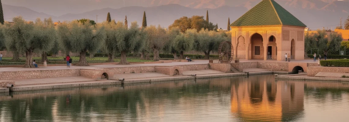 Les berges légèrement surélevées du bassin facilitent la dérivation de l’eau vers les seguias par simple ouverture de vannes ou de pertuis. Lors des périodes de fortes chaleurs, la surface du plan d’eau contribue également à rafraîchir localement le microclimat, un peu comme un climatiseur naturel à ciel ouvert. Aujourd’hui, le bassin abrite aussi une population de carpes et de poissons qui attirent l’attention des familles et des enfants. En fin de journée, lorsque le soleil décline derrière l’Atlas, le miroir d’eau se transforme en scène lumineuse, idéale pour les amateurs de photographie de paysage.